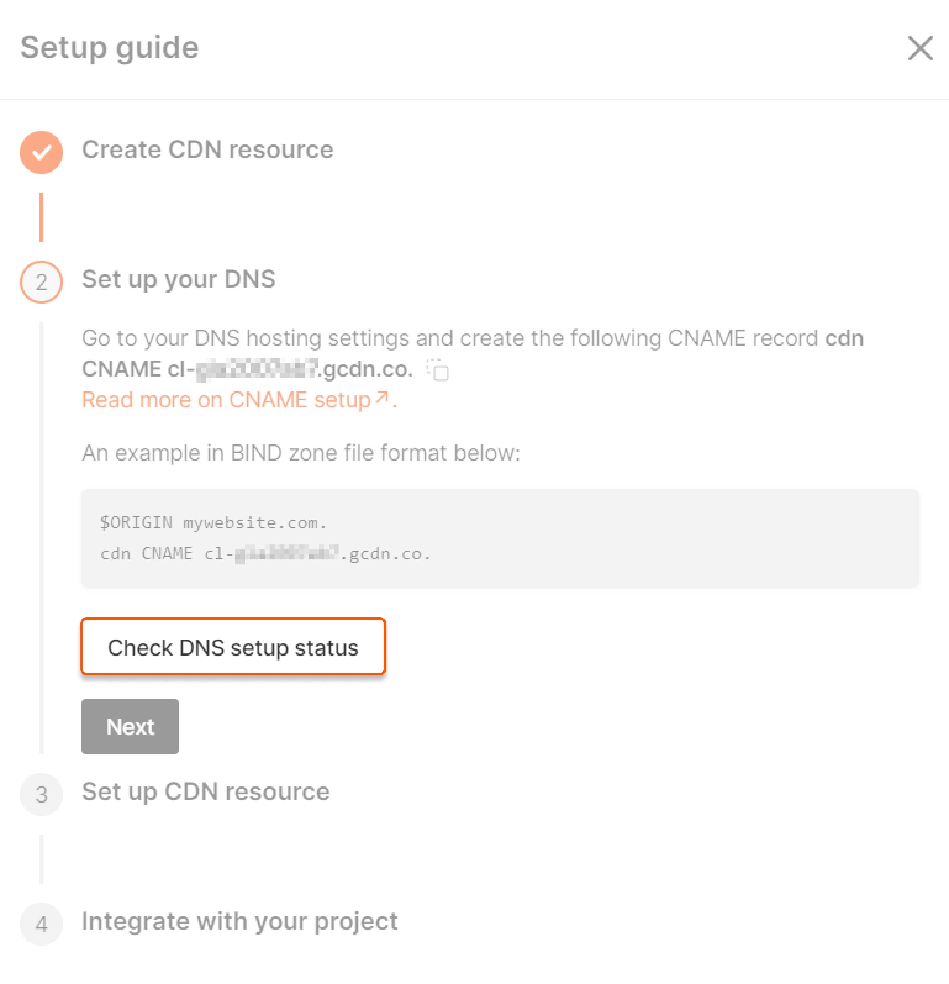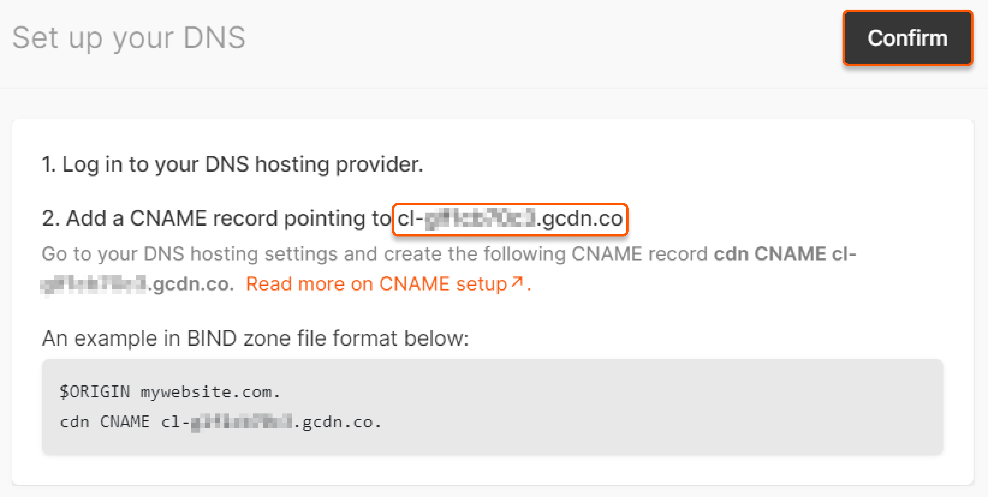2. Copy the value cl-****.gcdn.co (which is unique for every account and the same for all custom domains of your account) from the "Set up your DNS" page. Click Confirm.