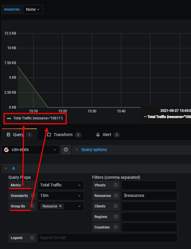The "Legend" field displays the values of the Group by field and the name of the metric by default: