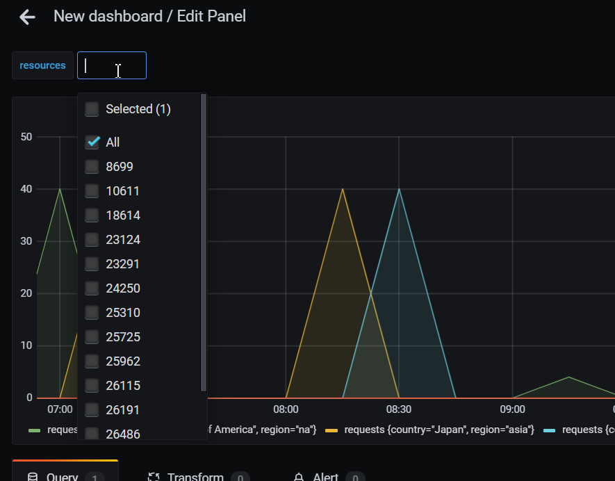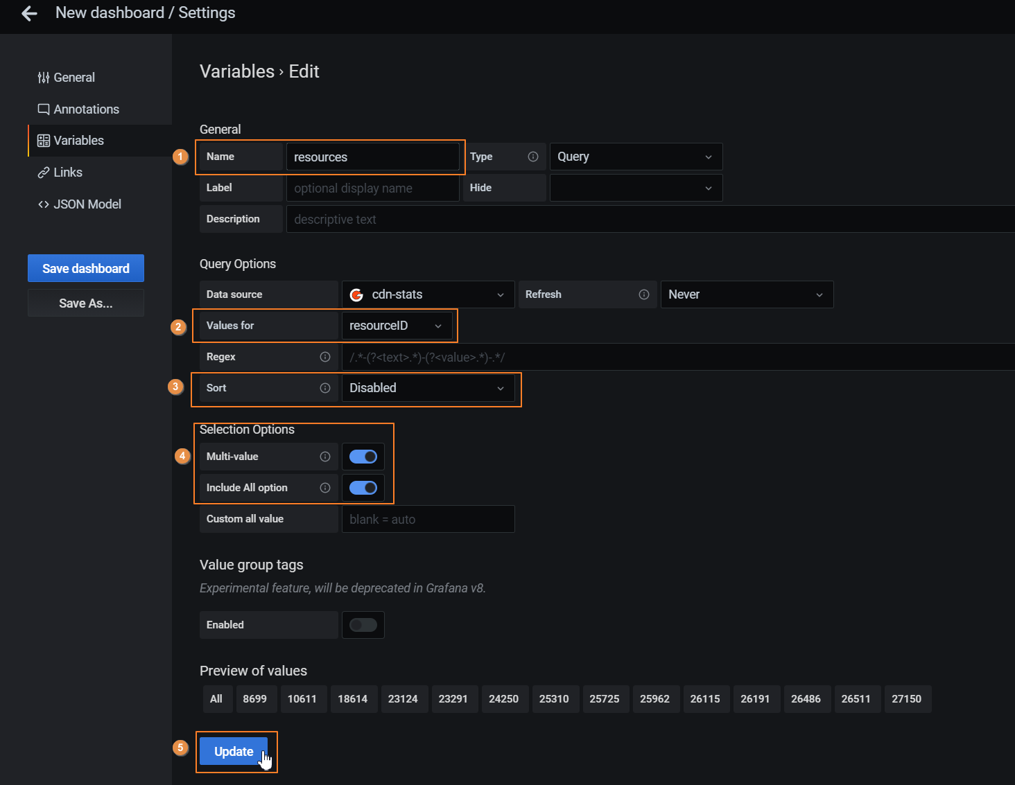 Connect the variable with the Dashboard. To do this, specify its name in the "Resources" field of the "Filters (comma separated)" section.