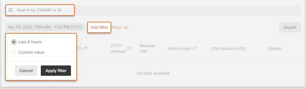 - To see logs of a specific CDN resource, enter its CNAME or ID.