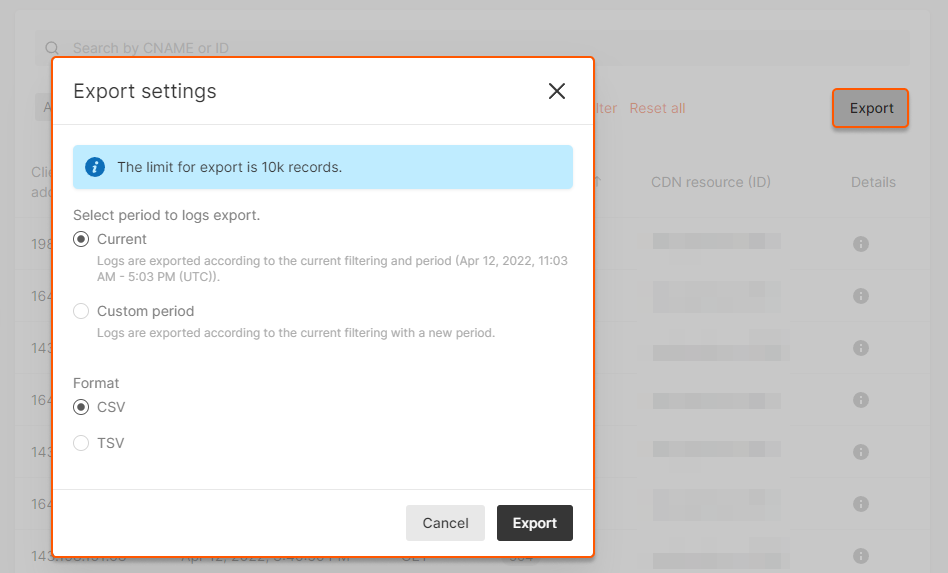 1. Click the Export button on the right side of the page. 2. Select the time range of logs you want to download: you can keep the current period (selected in filters when viewing), or set a new value. 3. Choose the export format: CSV or TSV. 4. Click Export.