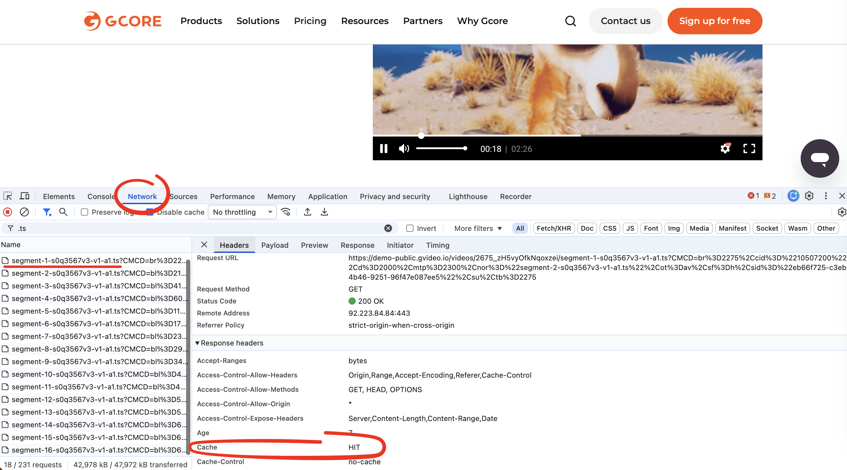 Cacheheader:Cache: HIT— the segment was served from the CDN edge cache. Fast delivery expected.Cache: MISS— the segment was fetched from origin. This is the cause of high TTFB.