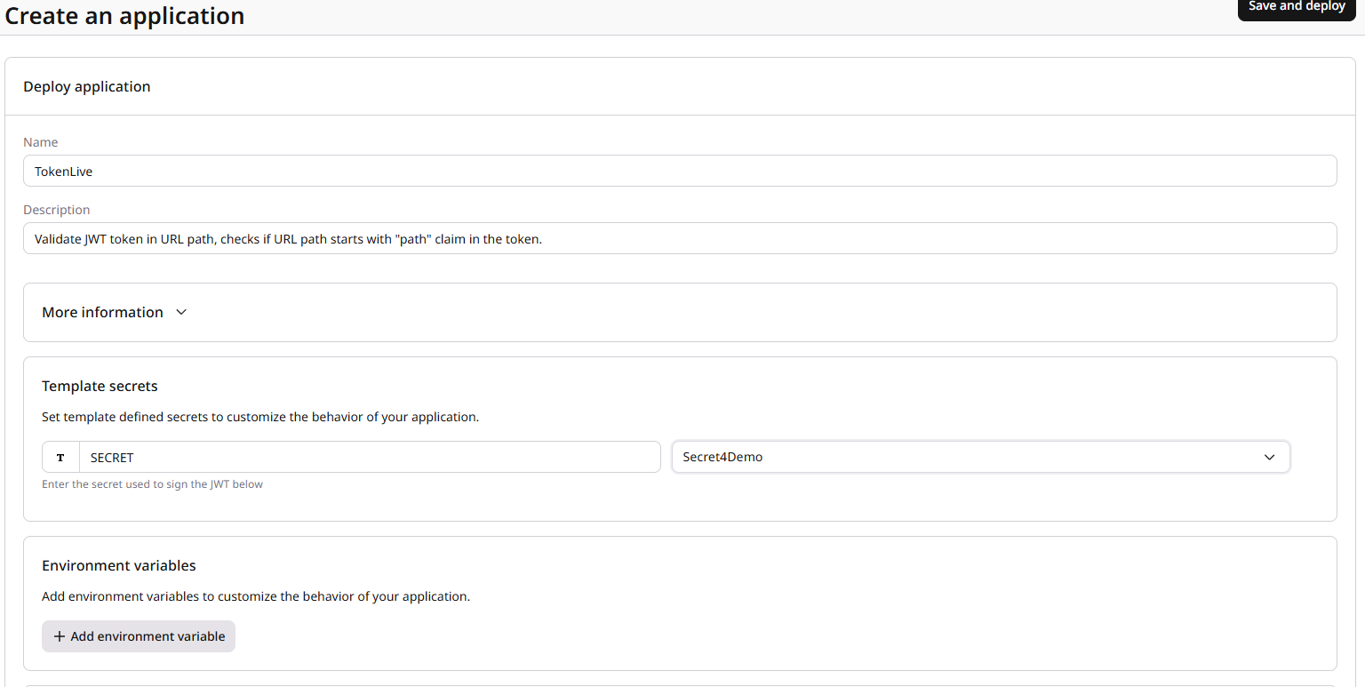 - Fill in the name and the shared key that will be used to sign the token, then click on Save and Deploy.
