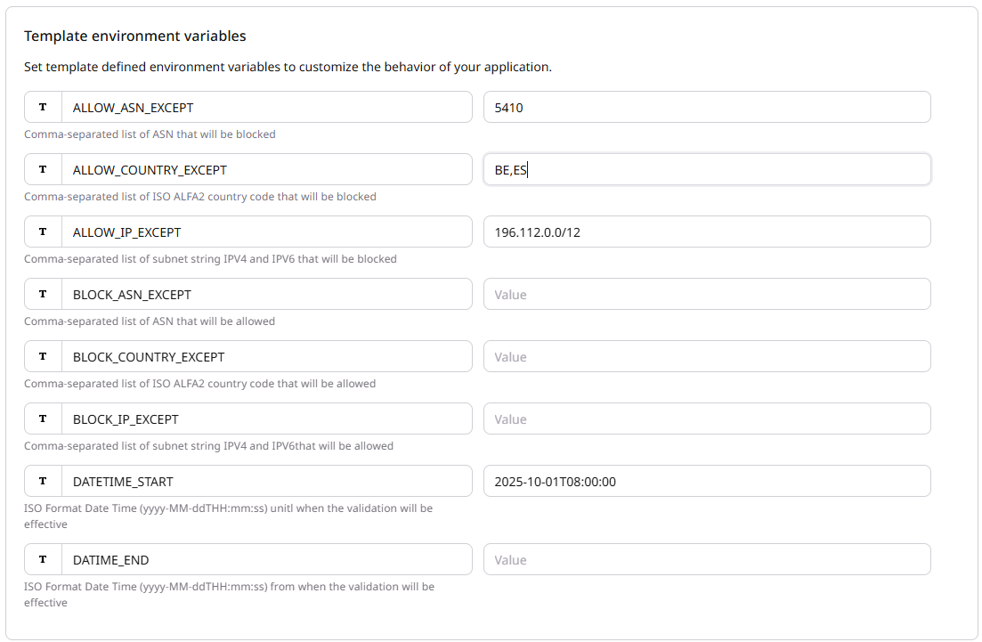 The internal/Client operation team member should configure at least one parameter from [ALLOW_COUNTRY_EXCEPT, BLOCK_COUNTRY_EXCEPT, ALLOW_IP_EXCEPT, BLOCK_IP_EXCEPT, ALLOW_ASN_EXCEPT, BLOCK_ASN_EXCEPT]