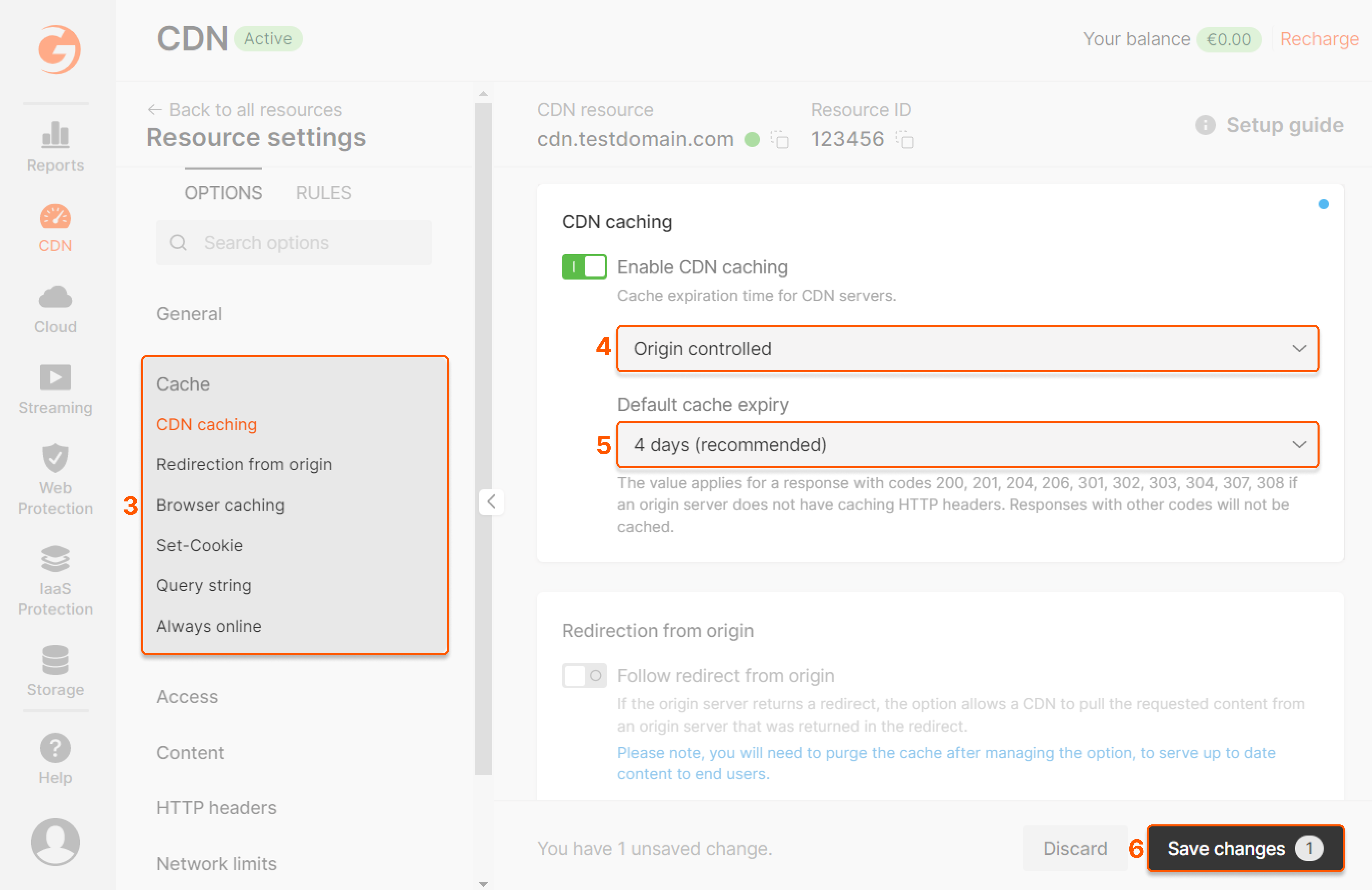 4. Make sure that the CDN caching is enabled. If not, click the Enable CDN caching toggle.