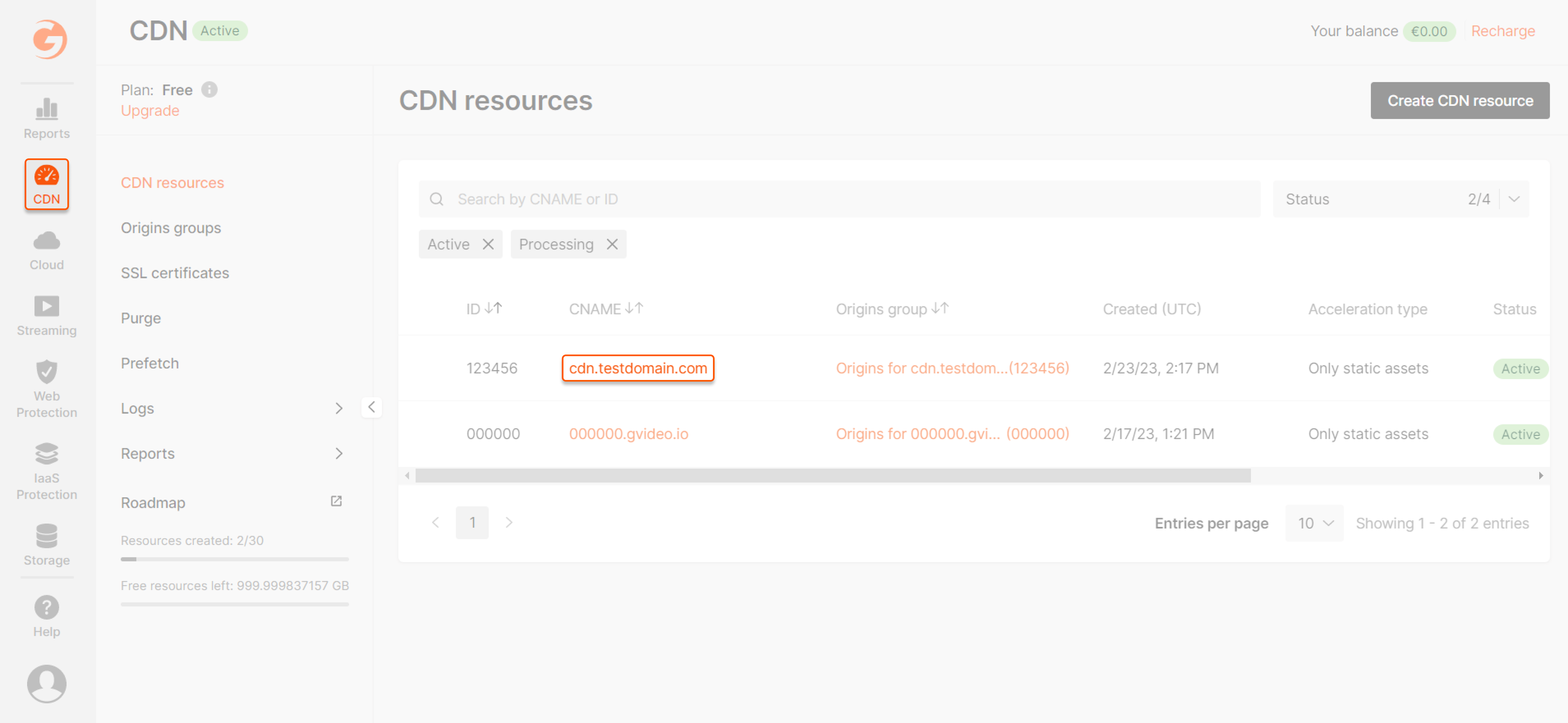 2. Go to the CDN section in the CDB Technical Web Portal and click the custom domain of the resource on which origin you configured the Cache-Control header.