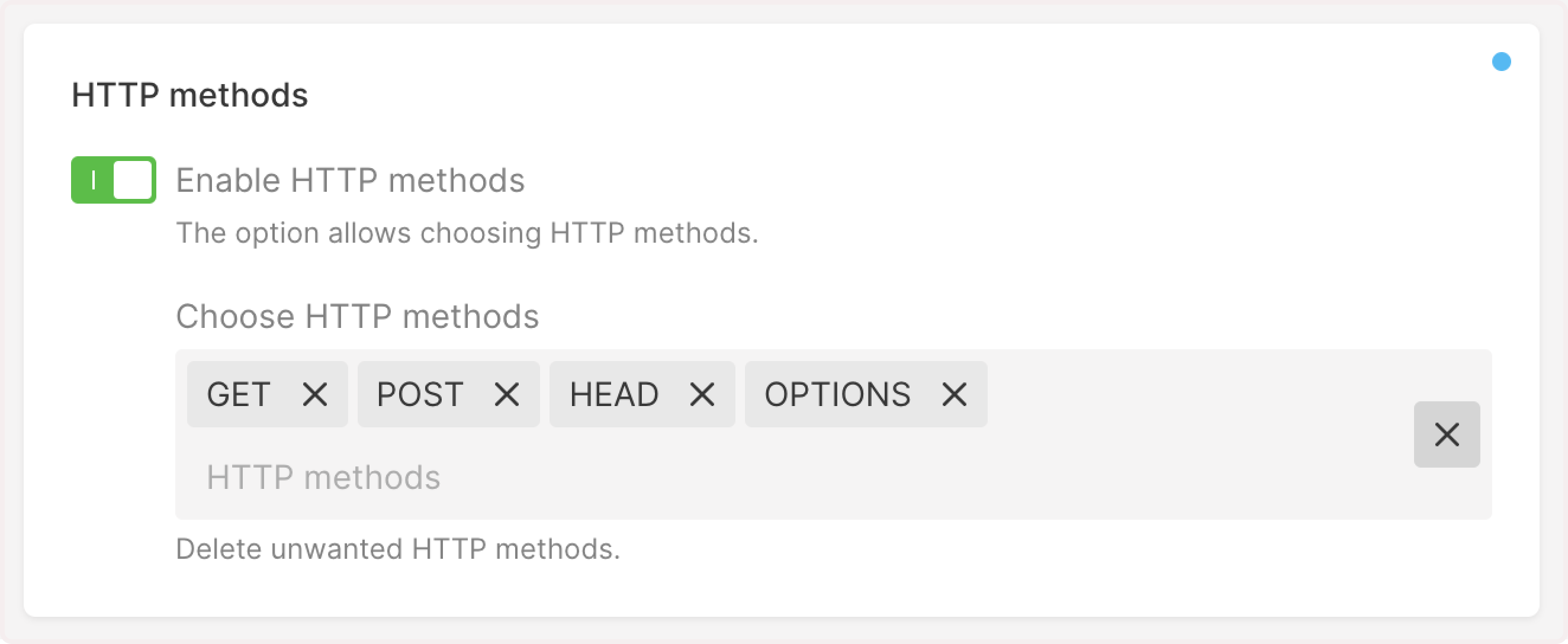 3. Scroll down to the HTTP methods section and click the Enable HTTP methods toggle to specify the necessary methods. The other methods you haven't specified will be blocked.
