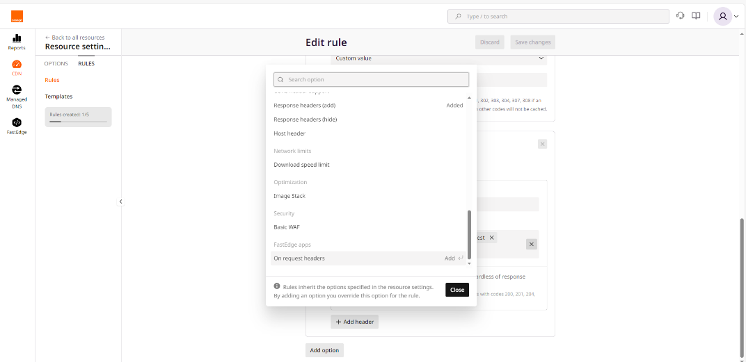 Or to a rule that match a pattern. For that select the rule click on Add option and select on request header, and rewrite option
