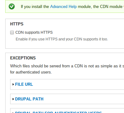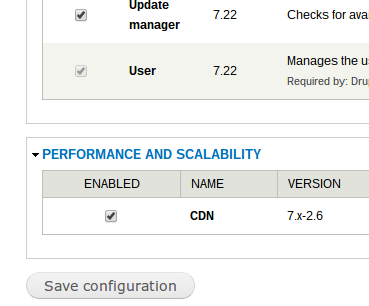 As soon as the CDN Module is successfully installed, get back to the modules list and scroll down to CDN. Choose Enable and Save configuration.