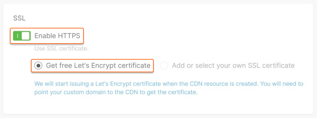 If you do not have your own SSL certificate, you can activate the free Let's Encrypt certificate in your account. Let's Encrypt certificates can only be issued for resources with a custom domain name.