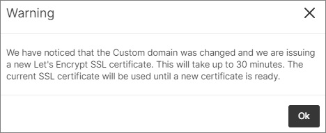 - Only one Let's Encrypt certificate can be issued per resource. If you need to add or remove an additional personal domain for a resource, we will reissue the certificate after making the changes. You will receive a warning that the current certificate will only be valid for 30 minutes and will be automatically replaced.