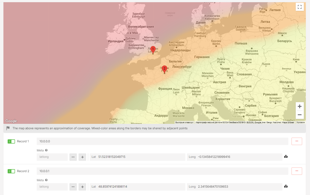 With the "Geo DNS" preset, you can add metadata of different types to each record.