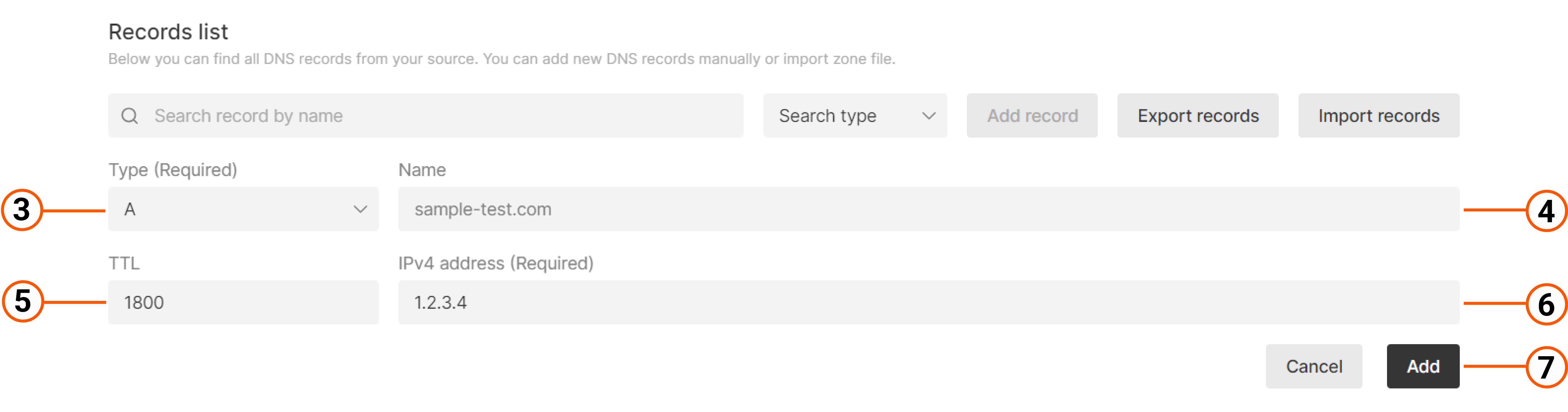 one, the record will be created forone.sample-test.com). - Enter an asterisk (*) to add a record for all subdomains at once (wildcard record).